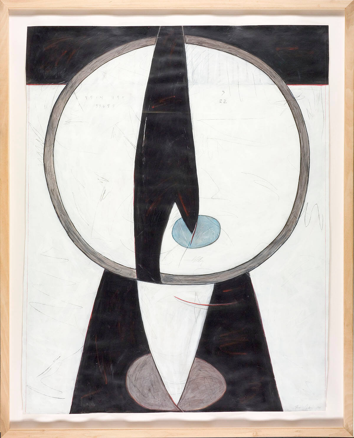 DescriptionThe central image is a large white circle outlined in gray with a black wedge shape in its center. A point of the wedge touches a smaller blue circle. The background of the work is white with grey, applied with expressionist brush strokes. Above the large circle is a black and green rectangle that is partially obscurred by the main large circle. Below the main circle is a white wedge shape that intersects with a grey oval in a field of black.Copyright© Shea Gordon