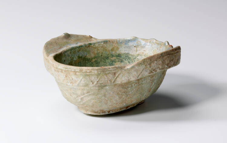 DescriptionOblong bowl with two flanges on the long sides. Serpentine design on side, zig-zag design in relief on edge. Iridescent green glaze.Gallery LabelThis wine cup is a tomb substitute for a real cup made of lacquered wood. Although real lacquer cups were occasionally placed in tombs, the much cheaper lead-glazed earthenware versions were acceptable substitutes.