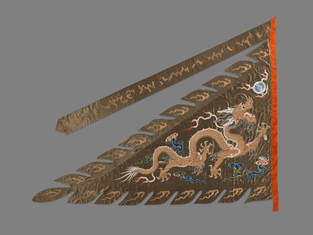 DescriptionTriangular flag with a decorative edge and a long thin strip attached to one end. Gold dragons embroidered on brown satin, with an orange border and lining.Gallery LabelWhen an acrobatic actor waved this large flag, the embroidered dragon would have appeared to leap to life. The dragon - an auspicious symbol common in Chinese textiles - wriggles to catch a flaming pearl in the upper right corner. Under the spotlight of a stage, the gold embroidery would draw the audience's attention.