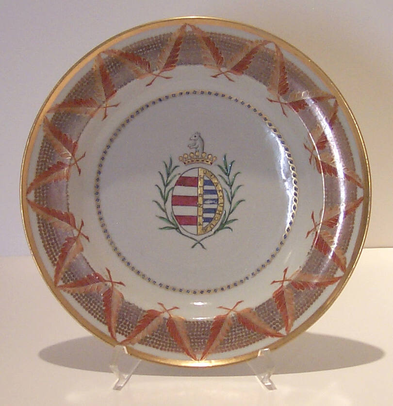 DescriptionDecorated with the arms of Silveria impaling Tavara. Border of crossed orange plumes.