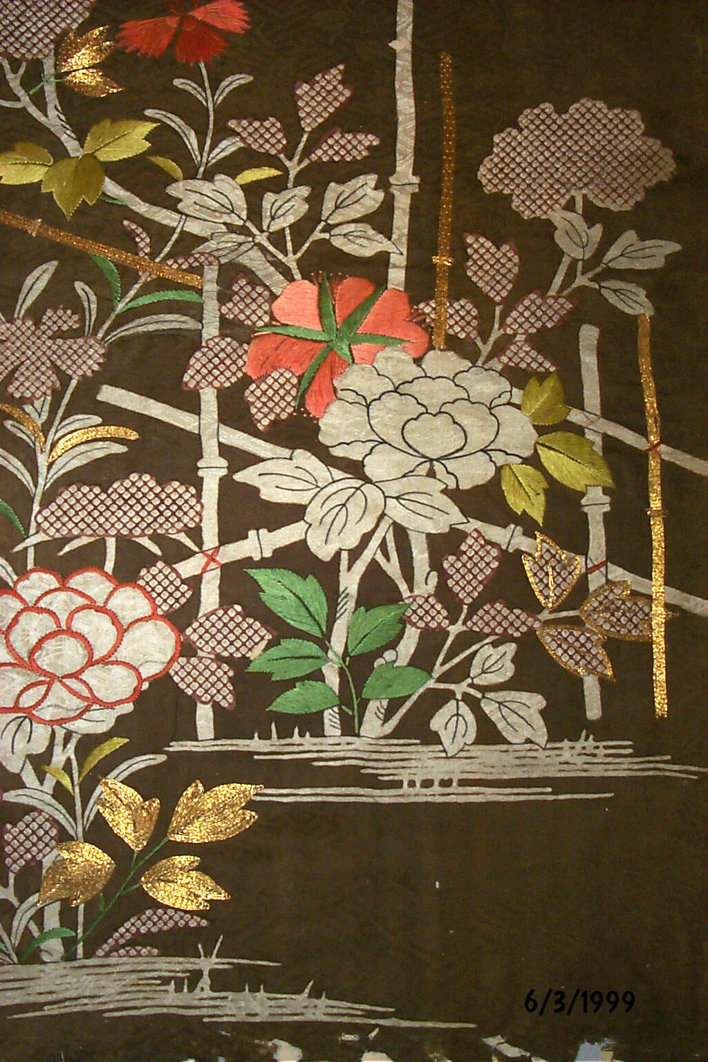 DescriptionBrown figured satin ground with stencil tie dyeing, silk and metallic thread embroidery. Fence and floral pattern (pinks and peonies) design.