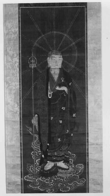 DescriptionJizô standing on two lotus flowers on clouds, holding a shakujo (staff) in the right hand and a jewel in the left. Gold halo behind the head.ProvenancePurchase –