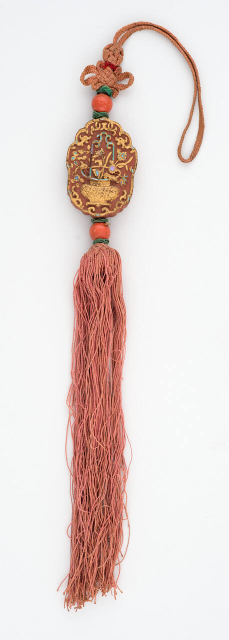 DescriptionPiece of medicinal clay carved and gilded with cord and tassel. May be dipped in water and applied to injuries.