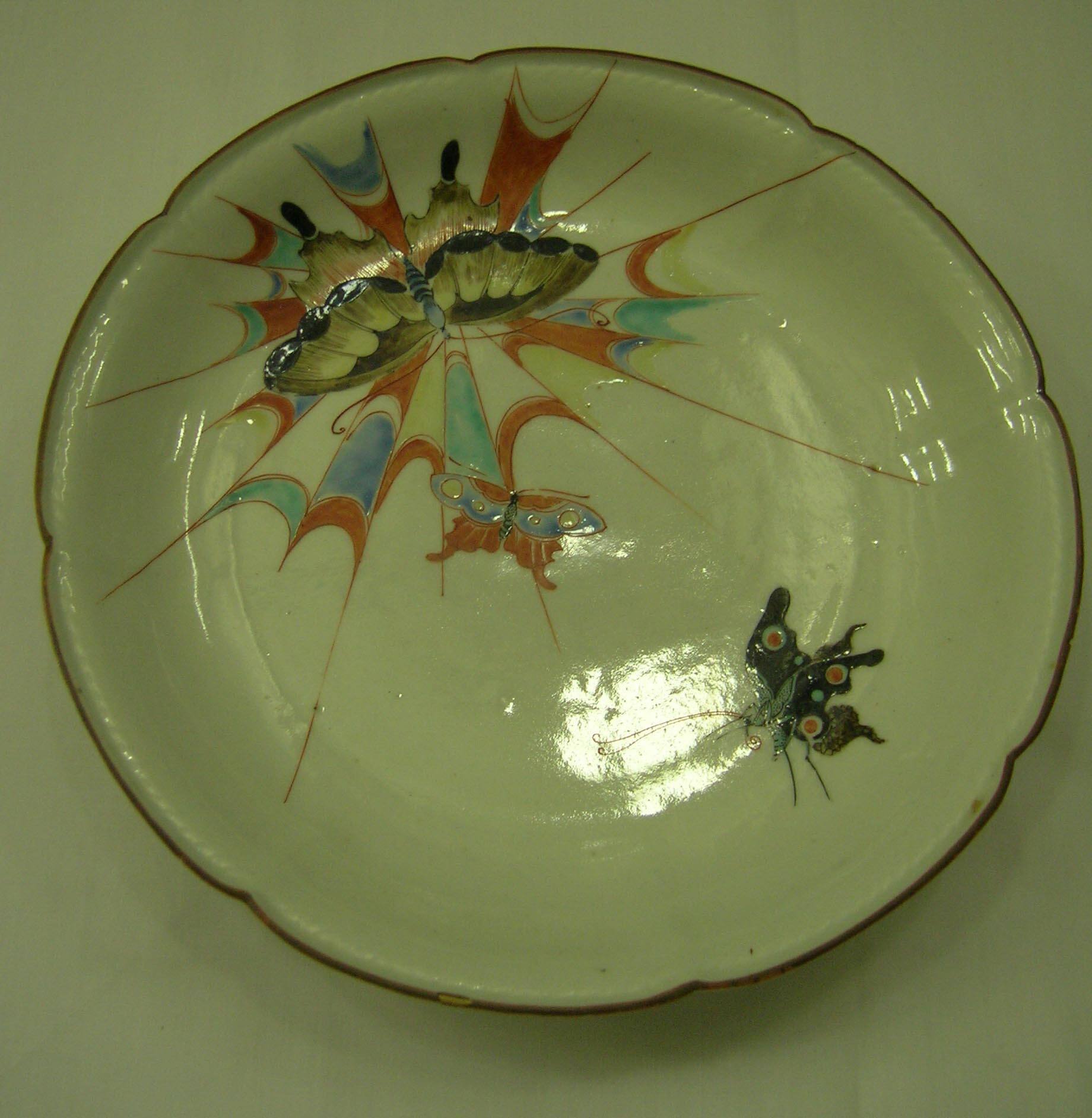 DescriptionMoulded lobed-shape with iron-brown rim; interior decorated with three butterflies hovering about a colorful schematized spider's web in overglaze iron-red, turquoise, blue, yellow, brown, and black enamels; the reverse undecorated; smooth milky glaze; five spur marks on bottom.