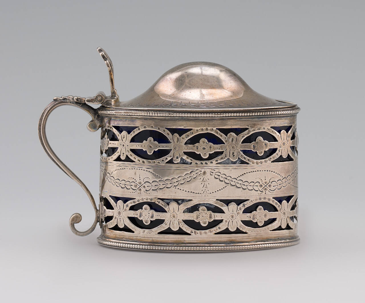 DescriptionBands of open work on body, scrolled handle with pierced shell thumb piece, beaded mounting, bright cut engraved, domed cover. Marks on bottom: HB, lion passant, leopard's head crowned, date m, George III. Spoon -- marks on back of stem: HB (others rubbed out).