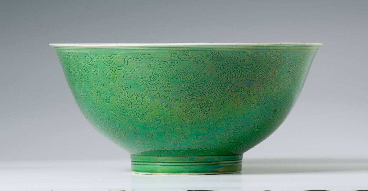 DescriptionOne of a pair of bowls with a green glaze on the outside and white on the inside, with an incised design of dragons and lotus under the green glaze. Has two small cracks.Exhibition HistoryEmperors, Scholars and Temples: Tastemakers of China’s Ming and Qing Dynasties, The Nelson-Atkins Museum of Art, August 12, 2016 – July 9, 2017.
