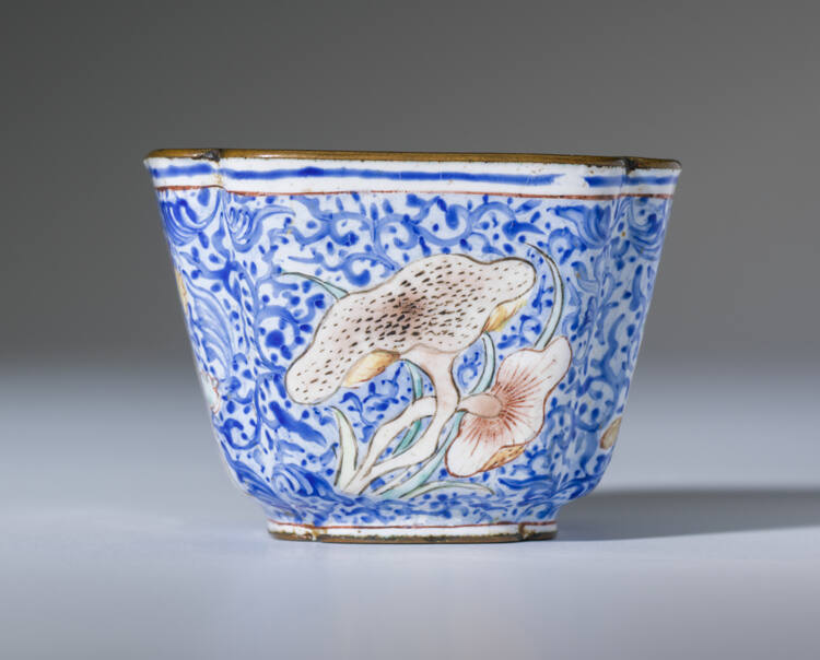 DescriptionChien Lung Canton square wine cup, part of a set of six wine cups and saucers, decorated with conventional flower, fruit, and insect designs, with a blue scroll pattern in the background.