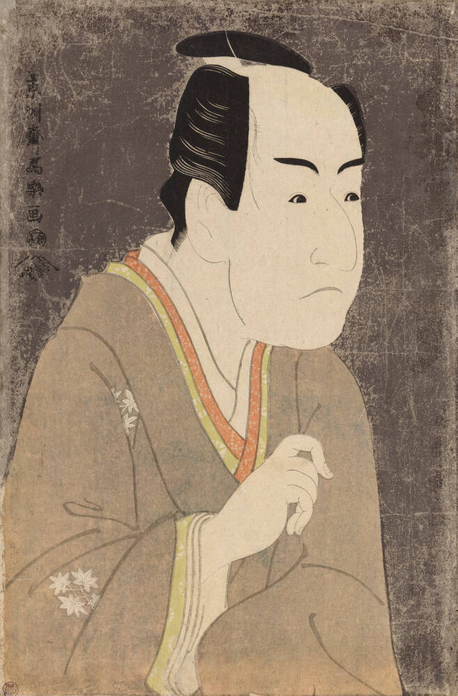 DescriptionOban Nishiki-e with mica background. This print was produced for the occasion of the play "Koinōbō Somewake Tazuna," performed in the 5th month, 1794 at the Kawarazakiza, a theater in Edo (present day Tokyo).Gallery LabelTōshūsai Sharaku abruptly quit making bust-length portraits of Kabuki actors less than a year after his debut in 1794. One theory of his sudden disappearance during the height of actor portrait popularity is that his style emphasized the actors’ physical features in a caricature-like manner. His unflattering portraits might have negatively impacted the way an actor was perceived as a character while on stage. For example, the image of Iwai Hanshirō IV in the middle captures the actor’s masculine traits like his thick neck and pronounced jaw. However, he is supposed to be portraying a woman with a slim body and soft facial features, a beauty trend valued in late 1790s Japan.