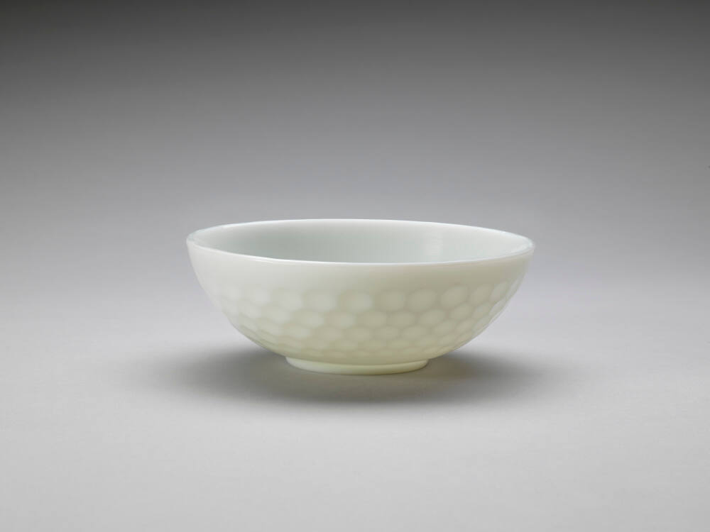DescriptionHeavy, white bowl with the appearance of mutton-fat jade. The faceting is concave which contributes to the light pattern on the bowl.