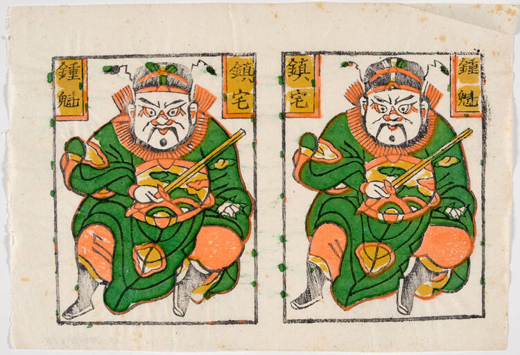 The large print that depicts Zhong Kui eyeing a bat, a symbol of good fortune, may have been posted on the inner side of a door. The small, double-image print can be cut into individual pieces and pasted at the corners of the house’s yard.
