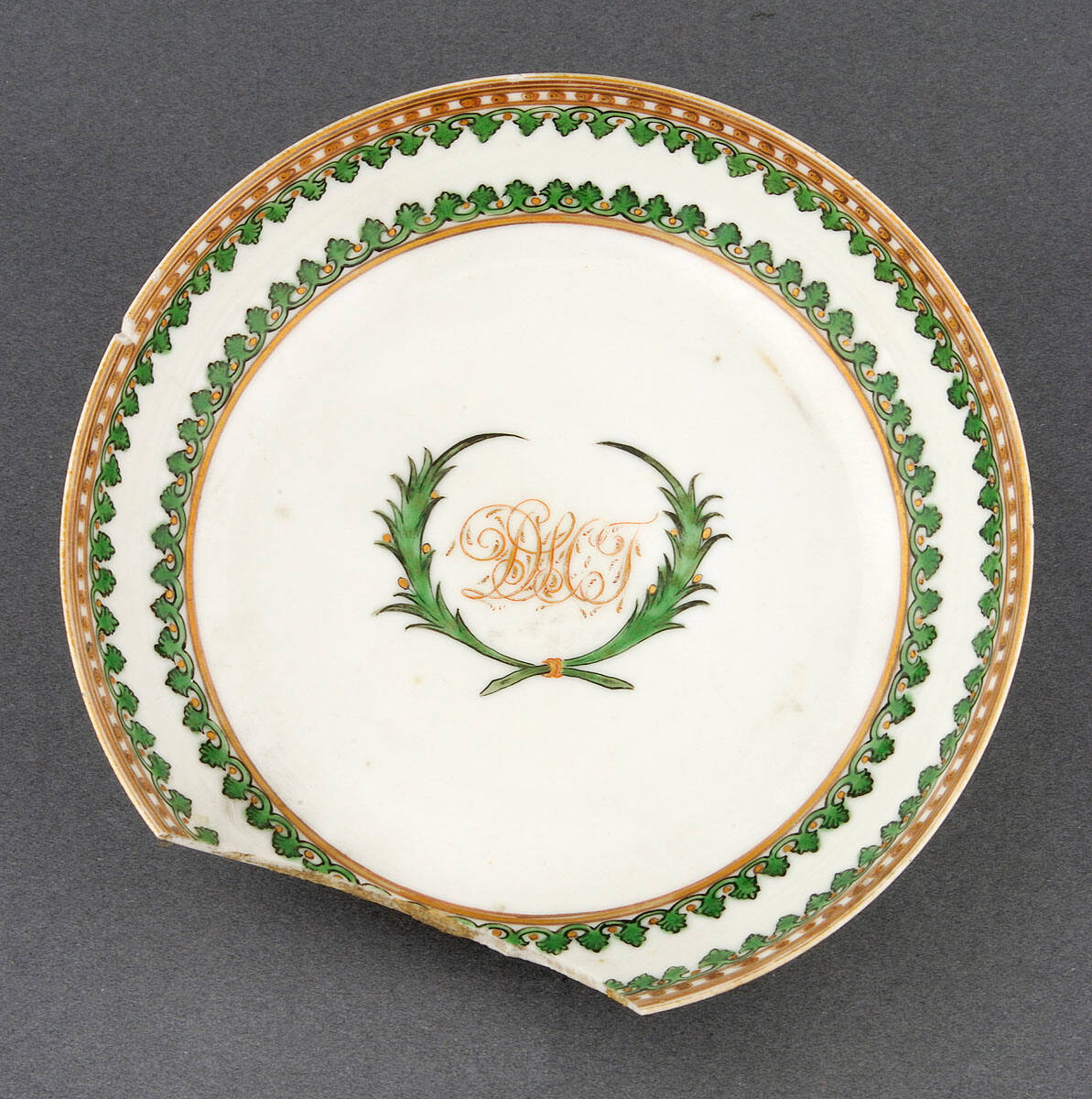 DescriptionWhite porcelain saucer decorated with two bands of enameled green and gold leaf designs; in the center is a wreath encircling the initials DLCT.ProvenanceMargaret Cameron Chapman (née Mann, 1865-1935), Kansas City, MO, by 1935;