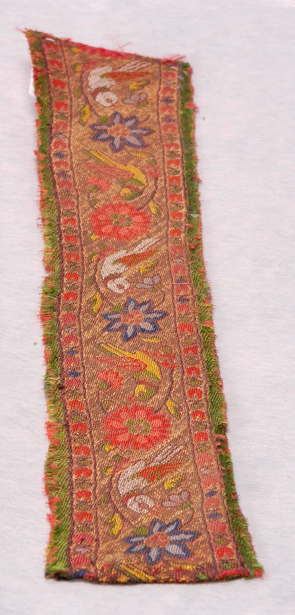 DescriptionBorder of undulating stem design in bright green, gold background, carnation and bird in blue, green, yellow, and orange.Exhibition HistoryNo exhibition history known at this time.