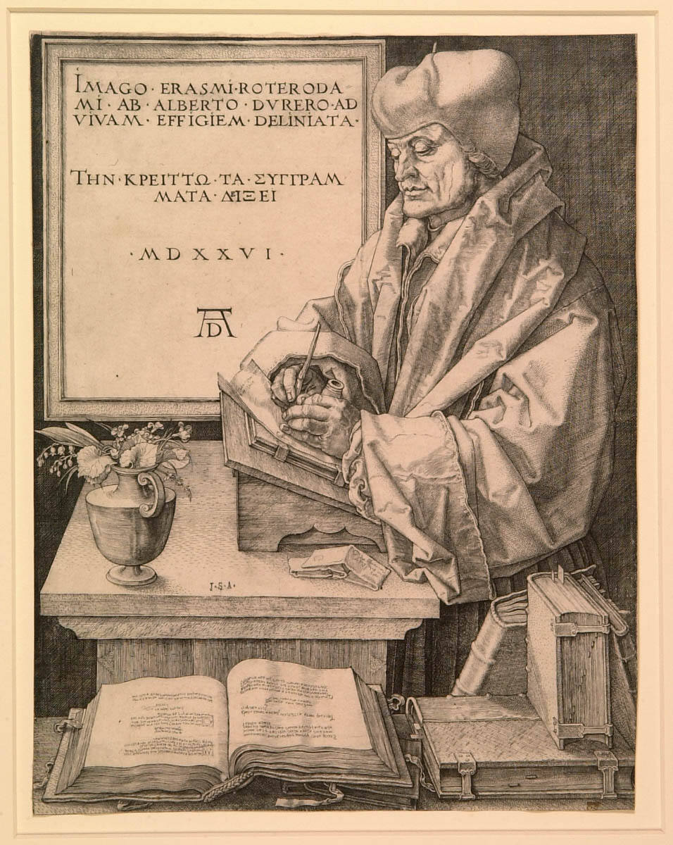 Erasmus of Rotterdam (ca. 1466?1536) was the most famous Humanist scholar of the Renaissance. Albrecht Dürer, the greatest German artist, was equally well-known, so, as with the Van Dyck portraits of artists hanging nearby, this is a portrait of one celebrity by another. Erasmus is shown writing at his desk surrounded by heavy tomes emphasizing his learning. Note the incisive engraving style, with the drapery folds obsessively articulated. This was typical of German Renaissance art and a hangover from the Gothic style.