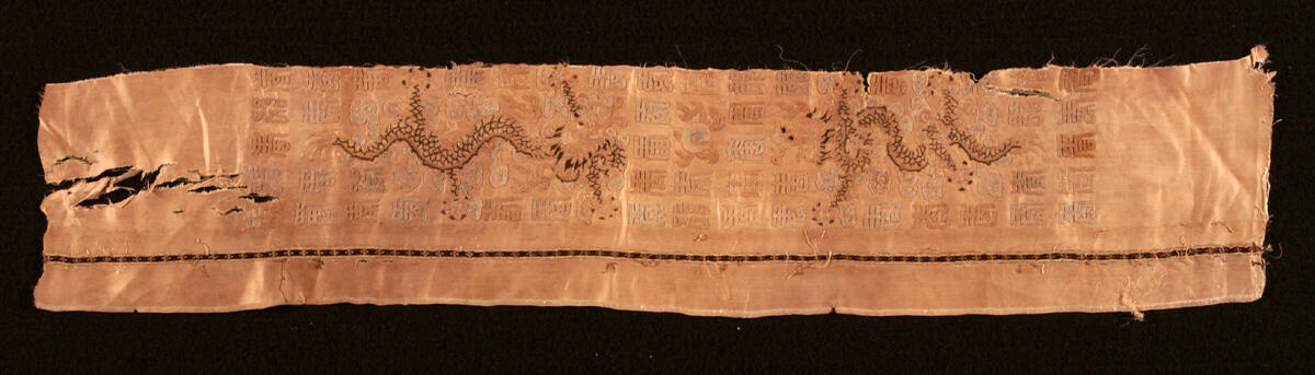DescriptionOne of a pair of sleeve bands. Tan satin embroidered in chain stitch in design of repeated two character inscription in five columns and two dragons chasing a flaming jewel.