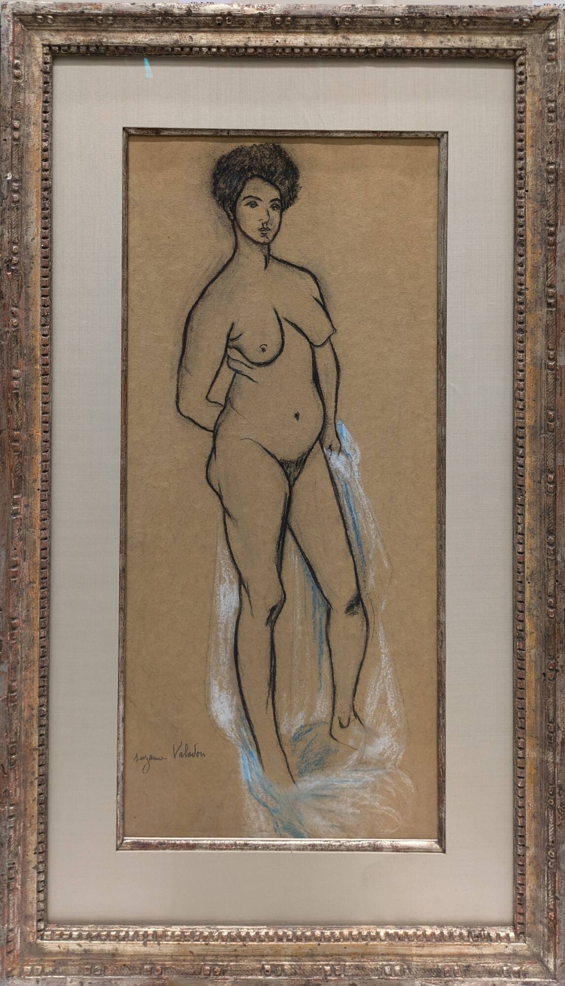 Gallery LabelSuzanne Valadon is known for her female nudes drawn with a firm, graceful line. While these are typically candid and uncontrived, here the model assumes a classical contrapposto stance. The right leg carries the weight of her body, while the relaxed left leg provides balance. Behind her back, she holds a white drapery, shaded in blue, which falls to the f loor and pools around her feet. Subtle touches of red lend warmth to the lines of her face, neck and shoulders. Valadon, a former circus acrobat and artist’s model, was the first woman admitted to the Societé Nationale des Beaux-Arts (1894) and was the mother of artist Maurice Utrillo.