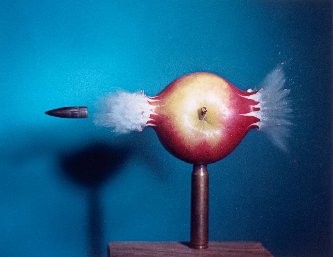 DescriptionStop-action color photo of a bullet piercing a mounted apple.Copyright© The Harold and Esther Edgerton Family Foundation