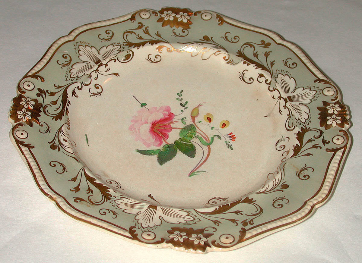 DescriptionA cream colored plate with gray border decorated with gilt flower and leaf design. In the center is a spray of flowers enameled in several colors. Cracked.ProvenanceWith Boswell & Ward, London, by September 9, 1932 [1];