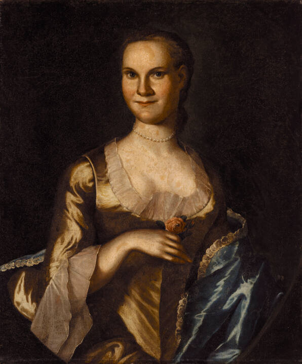 DescriptionHalf-length frontal portrait of woman with bulbous nose, smiling with close lips. Shimmering brown dress with blue cape draped loosely around shoulders. Lowcut neckline is trimmed in ruffled lace as are sleeves. Rose is held in right hand.Published ReferencesWinifred Shields, “Ancestor Portrait Show Leads to Bizarre Family