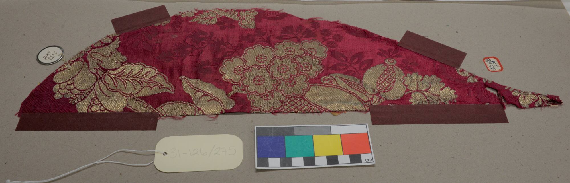 DescriptionConventionalized flowers in gold leaf on a crimson background.