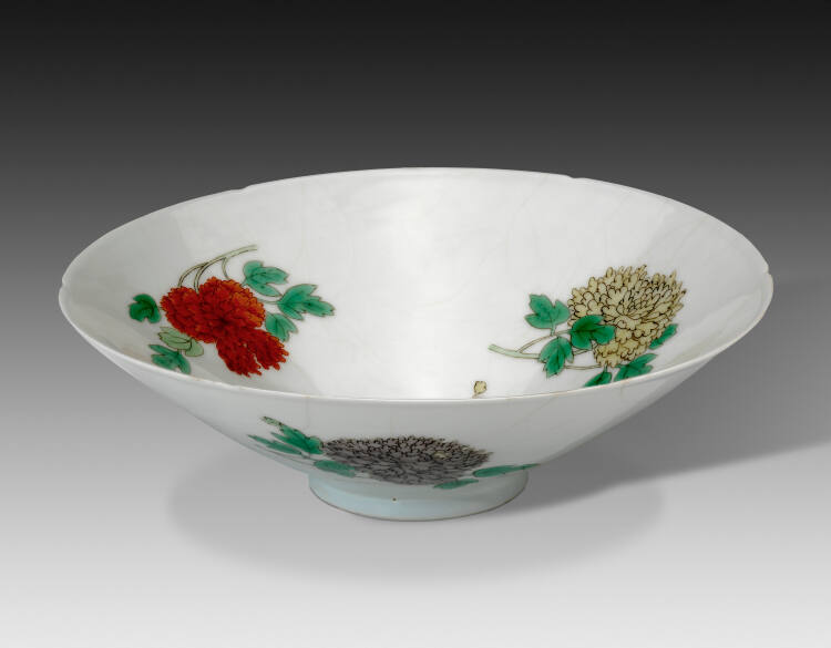 DescriptionImperial famille verte eggshell bowl decorated on the interior with peonies in coral, aubergine, and yellow. With a wooden stand.Provenance