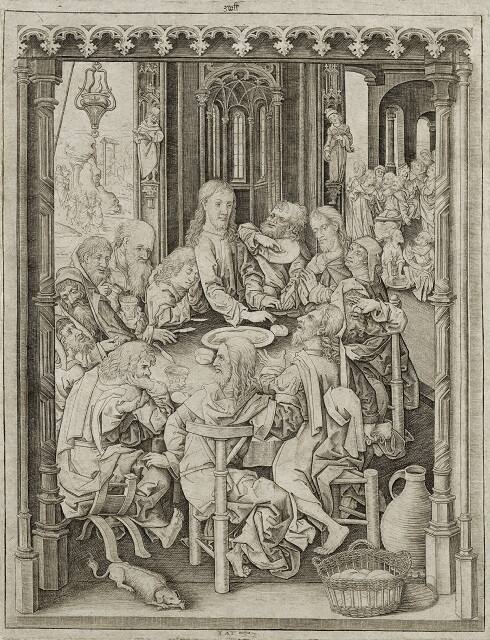 Gallery LabelAn elaborate architectural portal frames this scene of the final supper that Jesus shared with the Apostles before his crucifixion. In this scene, he has just announced that one of his disciples will betray him. Their mental anguish is conveyed in the agitated folds of their robes that overlap and blend together to create a unifying pattern. The culprit, Judas, sits in the right foreground, identified by the money he holds behind his back. The scene at upper left offers a glimpse of the procession to the garden where the betrayal took place after the Last Supper.