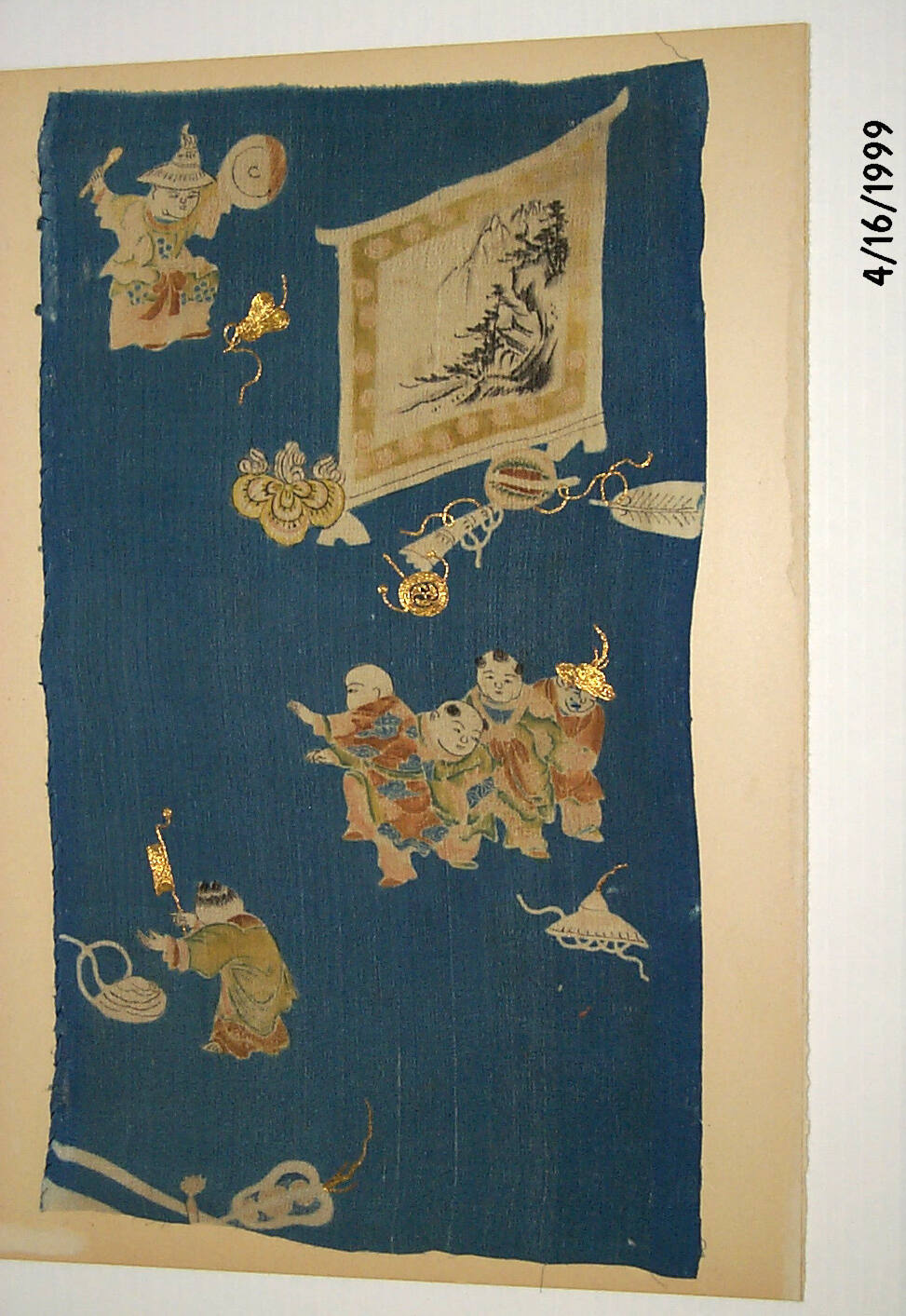 DescriptionDesign of Chinese children, fans, and a standing screen on dark blue background.