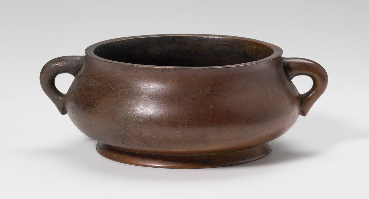 DescriptionRound bowl-shaped vessel with vertical neck, flat round rim, "C" handles, and slightly everted foot ring. The outside patina is mottled dark honey brown while the inside patina is black from burning materials with some light green patina.