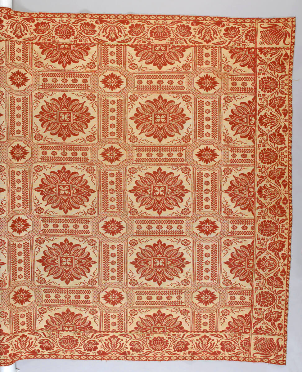 DescriptionRed and white, double weave coverlet with several, repeated units of floral decoration -- daisylike flower within an octagonal frame of cross stitch design; panels with a pine tree and snowflake pattern which frame a large lilylike flower and a smaller flower in each of the corners. These floral units are in turn framed by a wide border of design resembling a wild cactus flower; an urn is portrayed in two of the border corners. Below this border is a narrower one of repeated floral units.