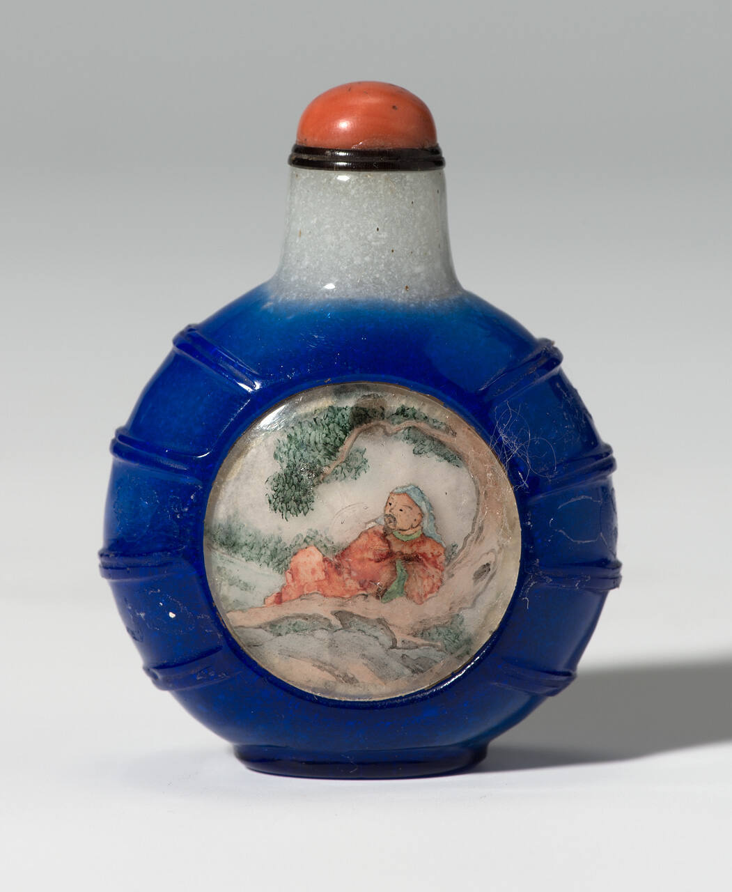 DescriptionUnique enamel painted Peking camphor glass disc-shaped bottle overlaid with translucent blue glass around the shoulders and the bottom, and carved with rope work, the center circular panels of opaque white glass painted on one side with a scholar underneath a tree and on the reverse with three children at play and sealed under transparent glass, black collar and coral stopper.