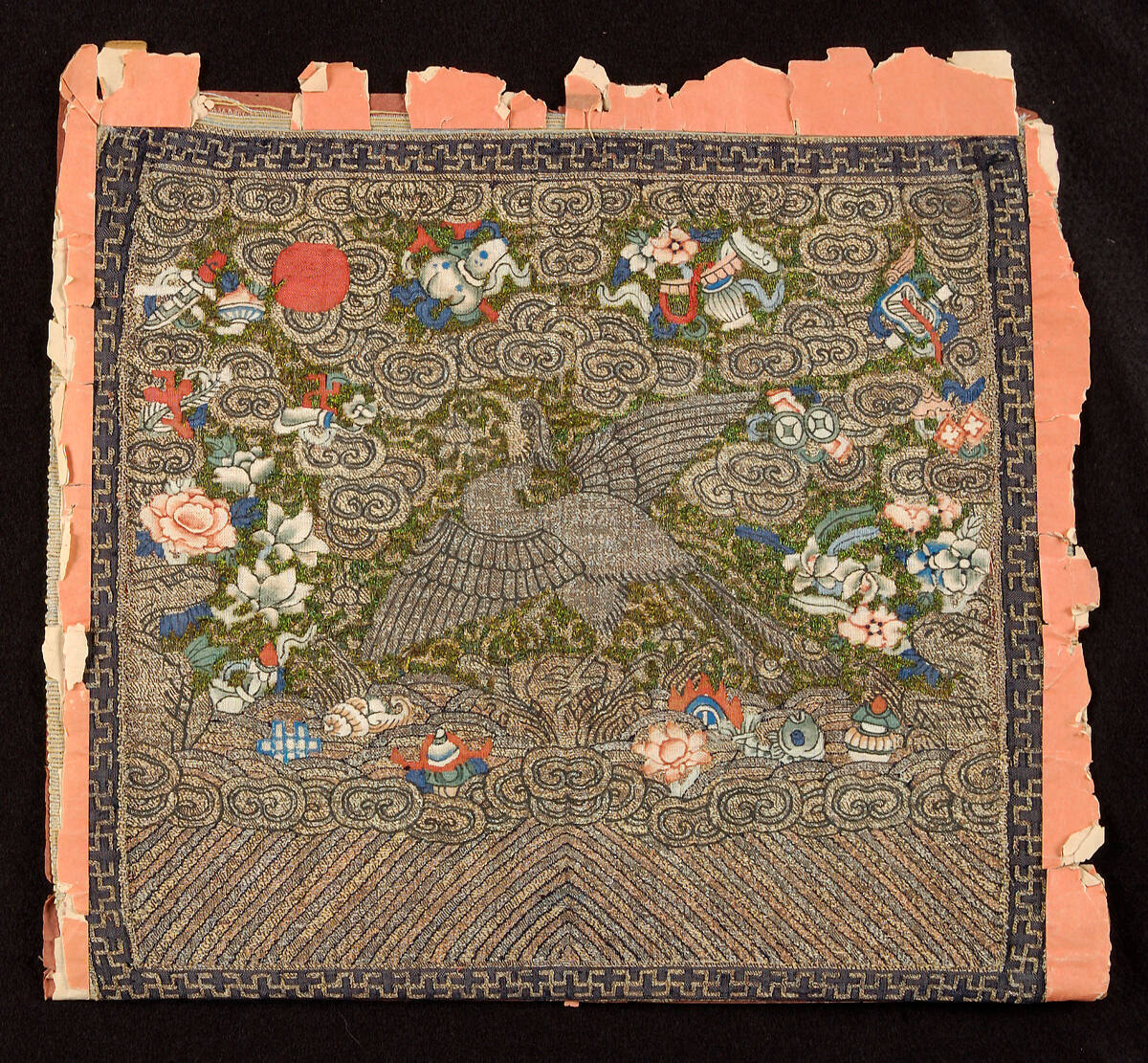 DescriptionPeacock, polychrome and gold and silver, with remnants of feather couching.
