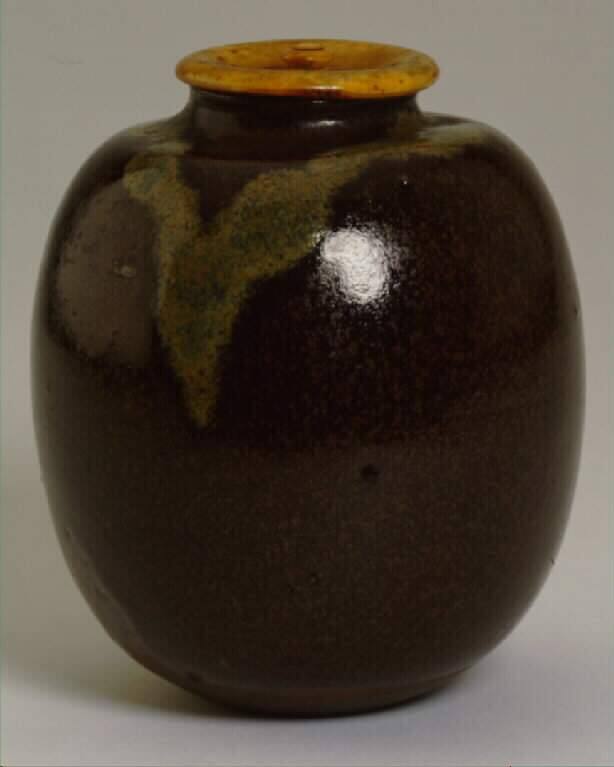 DescriptionAn ovoid tea caddy of drab clay covered with a dark brown glaze with rusty speckles; grayish brown running glaze on the shoulder. With a lid.