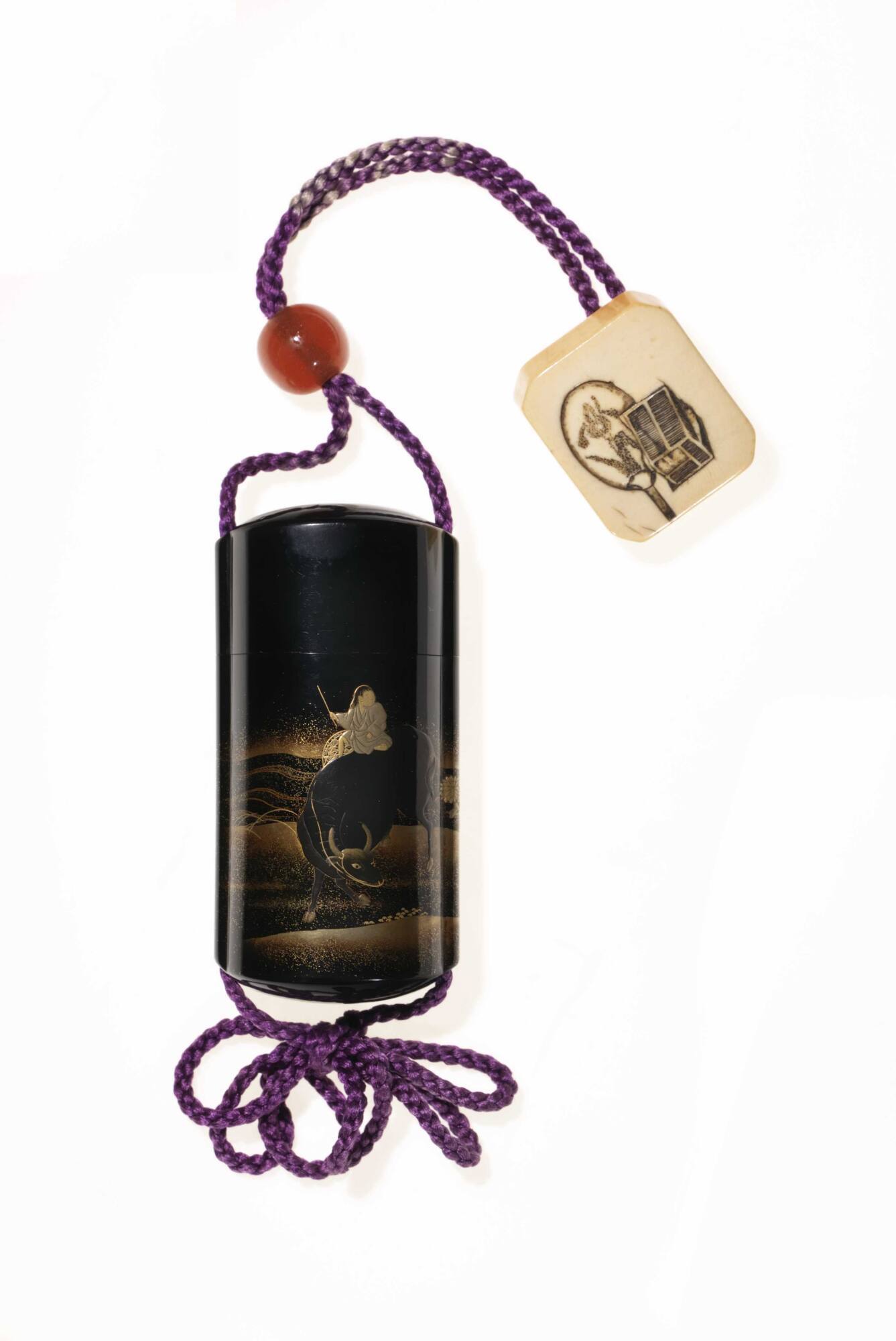 MediumBlack lacquer inro with ivory netsuke