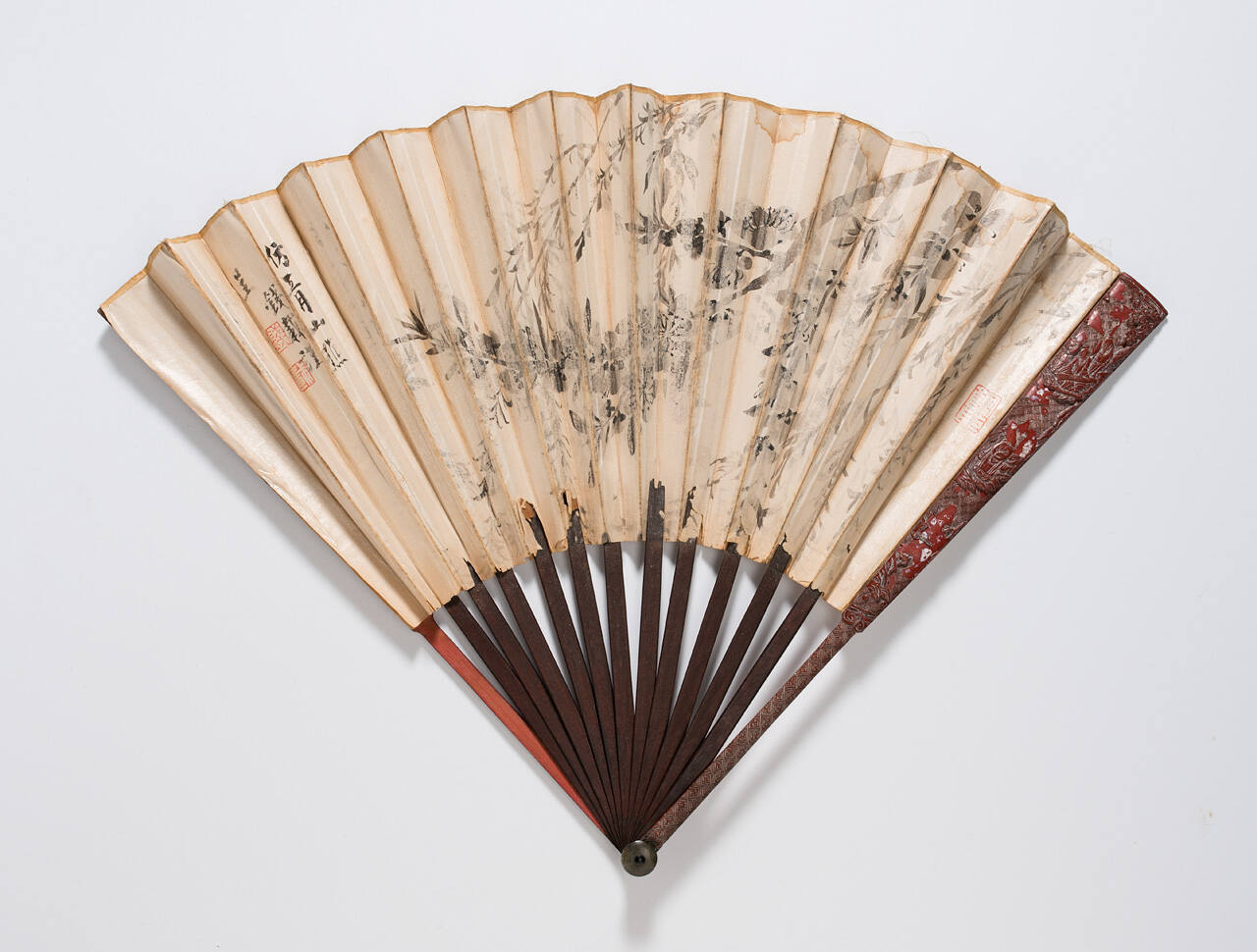 DescriptionOutside deeply carved with sages and landscape. Painted with apple blossoms and willow branches. Gold back covered with writing.
