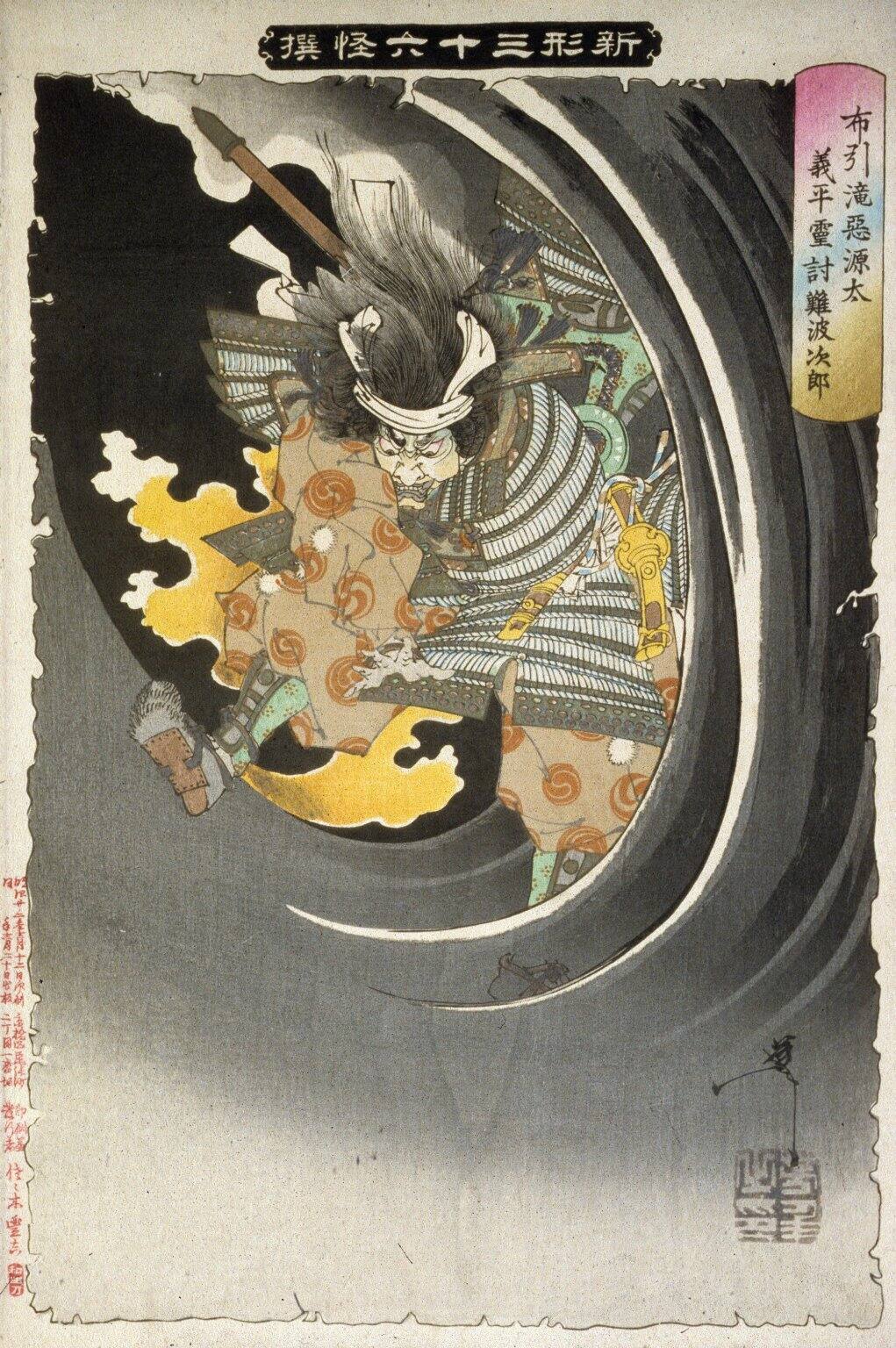 The Ghost of Wicked Akugenta Yoshihira Attacking Namba Jiro at Nunobiki Waterfall