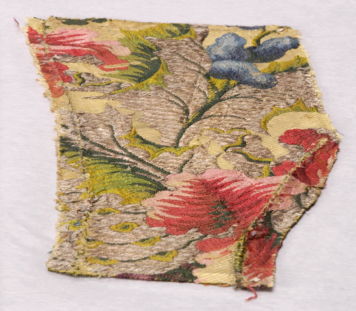 DescriptionNaturalistic design of flowers, stems, and leaves in red, yellow, green, and blue on a background of gold thread.