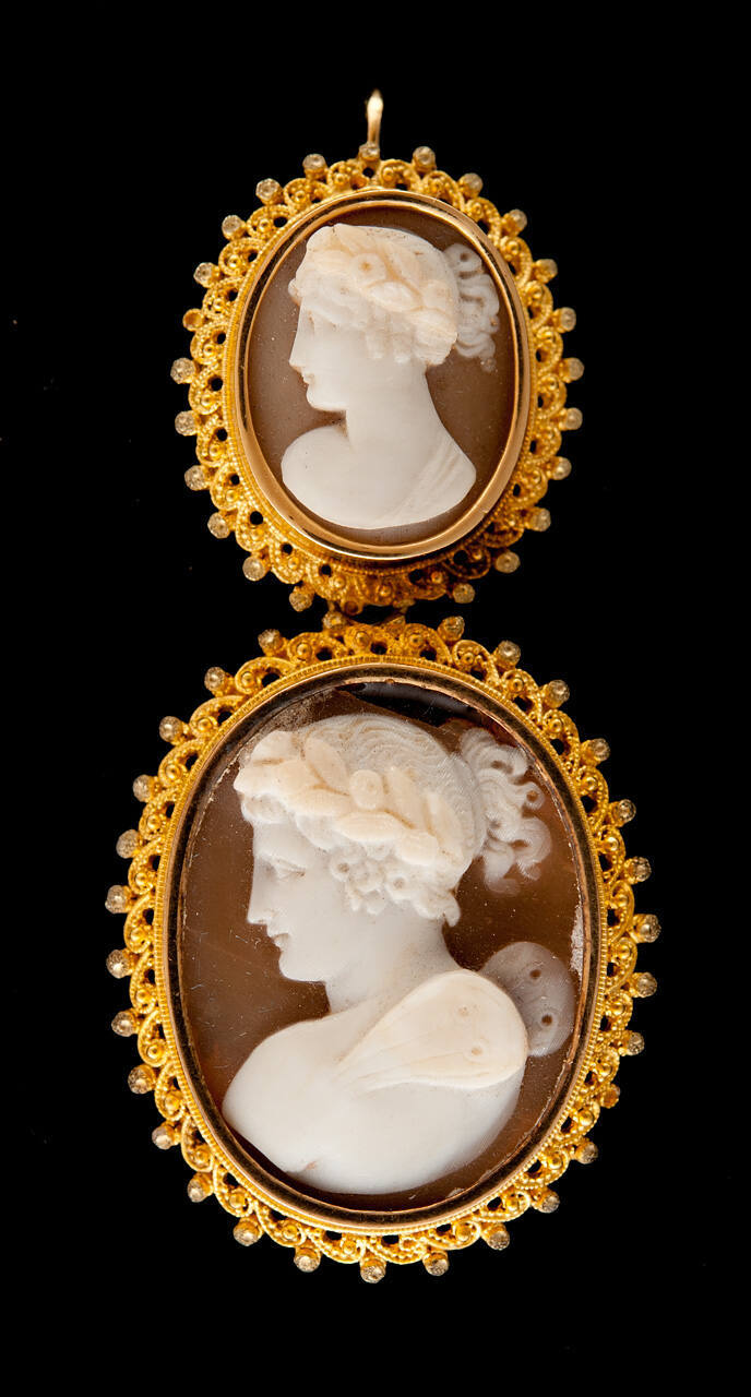 DescriptionOne of a pair of earrings for pierced ears of two oval brown cameos with white classic heads set in gilded copper, suspended on below other.ProvenanceLinda S. Hall (1859-1938), Kansas City, MO, by 1938;