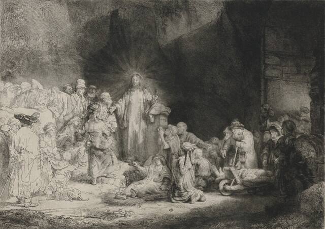 Rembrandt combines several events from the Gospel of Saint Matthew in this masterful demonstration of technical skill and imaginative power. A radiant Christ stands silhouetted against a dark arched shadow as he blesses the sick who gather on the right. Their carefully modeled forms contrast sharply with the debating figures of the Pharisees on the left. These rich and powerful men engaged Jesus in a debate about divorce in an effort to expose him as a pretender. Barely indicated with lightly etched lines, they recede in importance when compared to people who are poor and disabled.
