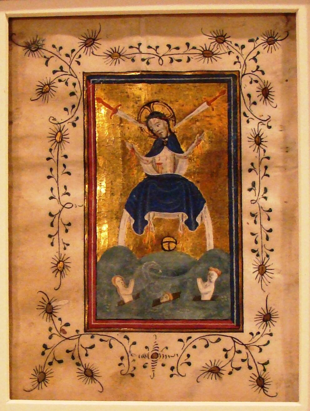 DescriptionA bleeding Christ in a blue robe with gold halo, two large swords pointed at this head, seated on a rainbow (?) Three corpses rising from their graves. Gold background, green landscape.Exhibition HistoryThe Treasury: The Splendor of Liturgical Objects, The Nelson-Atkins Museum of Art, Kansas City, MO, August 21, 2005-February 8, 2006, no cat., as The Resurrection of the Dead.