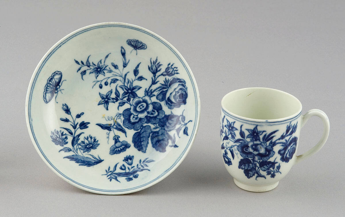 DescriptionCup and saucer decorated with imagery of roses and butterflies.
