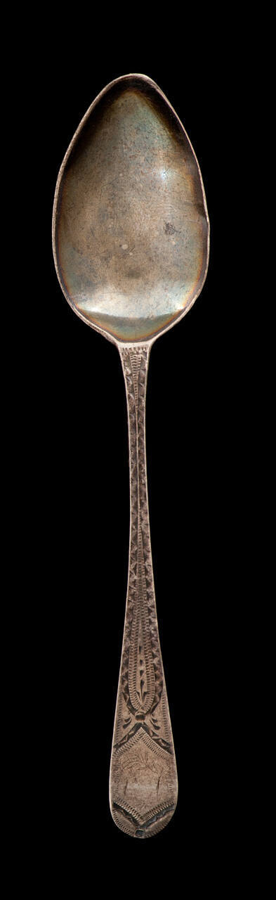 DescriptionUnadorned bowl; narrow stem widens and turns under slightly at the end. Recessed zig-zag pattern outlines stem, crossing at the handle. Marks on understem: PB AB, lion passant, date r, George III.