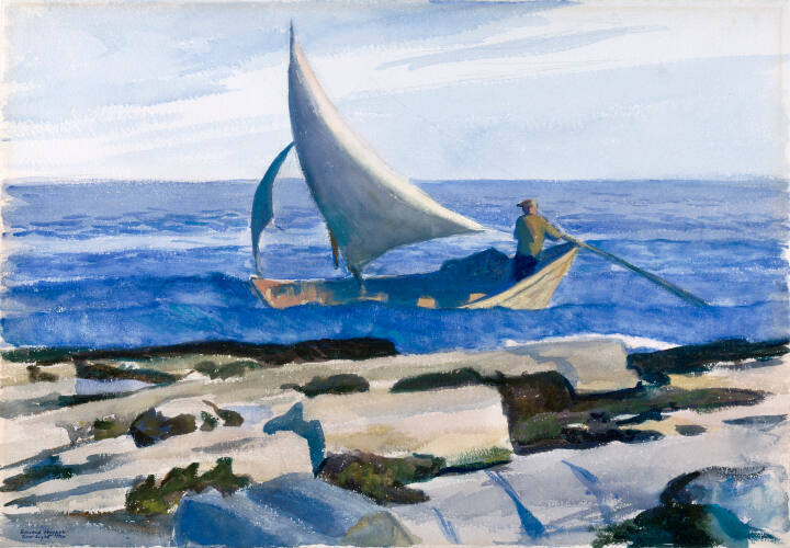 Edward Hopper’s annual summer travels provided him opportunities to paint extensively in watercolor. In The Dory he painted an abstracted scene with bold, simplified forms. A sailor rows near the rocky coastline of Two Lights, Maine, a small Coast Guard community. This solitary figure was an unusual inclusion for Hopper. His 1920s watercolors more often allowed houses, boats and automobiles to stand in for people in his scenes. Turned away from the viewer, this figure maintains his distance and an aura of isolation.