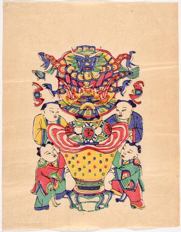 Gallery LabelA long, long time ago, a fisherman found in his fishnet an urn that could replicate everything placed in it. He placed money and jewelry in the urn and soon became rich. The treasure urn is similar to the horn of plenty in Western art and can also be a bold emblem of great wealth. Here, four boys flank a wide-mouthed urn inscribed with three Chinese characters: ju bao pen, meaning "gathering," "treasure" and "urn." A dragon flies out from the gleaming jewels and coins. Underneath the urn is a huge gold ingot.