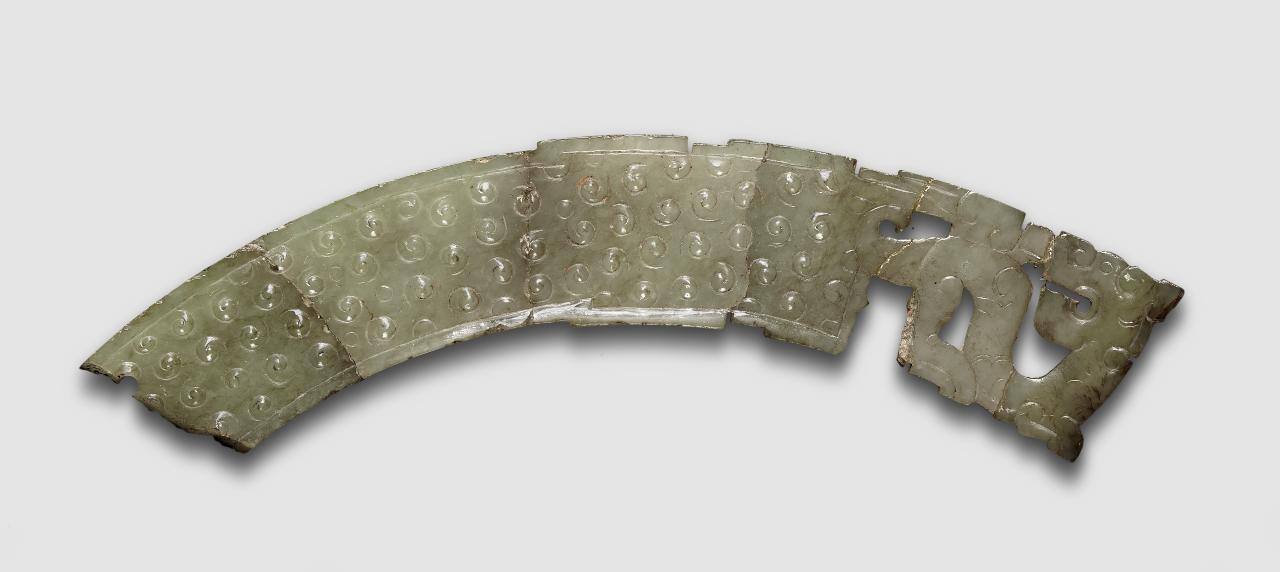 DescriptionThin, light green arch-shaped object with raised dots on the surface and openwork at one end. Several cracks are visible on the surface.