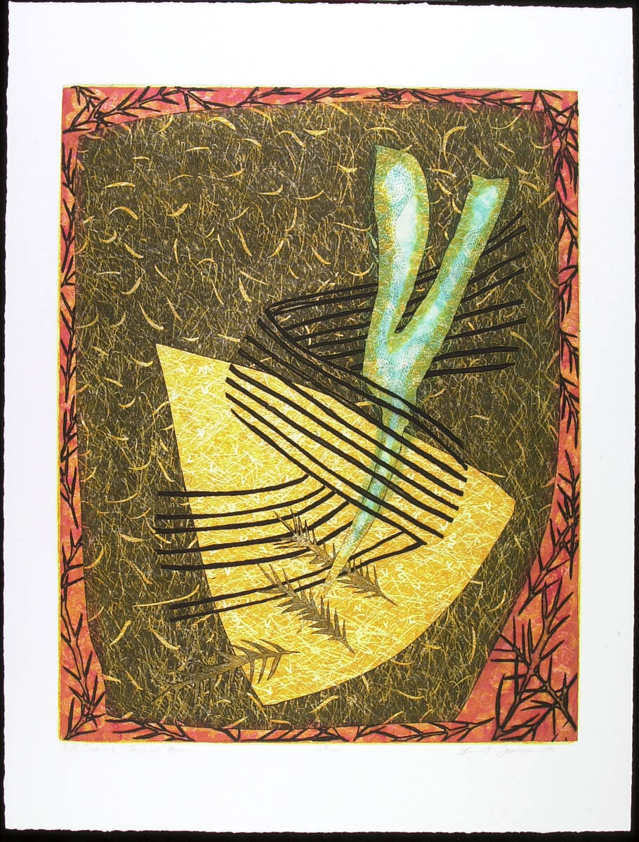 DescriptionAbstracted, graphic designs on colorful background. In the center is a blue-green Y-shaped image wrapped in coiling lines. Behind this is a large yellow triangle and abstracted vegetation. Vegetation frames the image.Copyright© Ann Taulbee