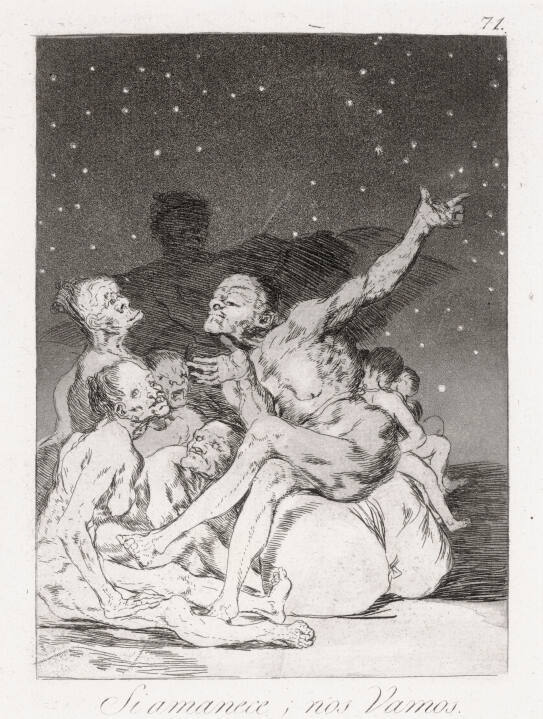 Purchased from Alden Galleries by The Nelson-Atkins Museum of Art, Kansas City, MO, 1933.Tomás Harris, Goya Engravings and Lithographs, vol. 2 (Oxford: Bruno Cassirer, 1964), no. 106, p. 149, (repro.), as Si amanece; nos vamos. (When day breaks we will be off.).