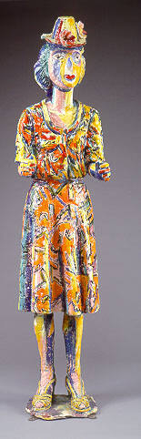 DescriptionLarge standing figure of a woman wearing a dress, hat, and shoes. The elbows of the figure extend outward at 90-degree angle with upper body slightly pitched forward. Ionist strokes of glaze in vibrant tones (predominantly orange, yellow, blue, and green) and black lines. The legs are mostly yellow, blue, and pink. The figure has bright red lips.Gallery LabelViola Frey has been described as a "visual anthropologist of contemporary culture." The sources for her vividly alert figures are fellow bus riders and others observed during the course of daily living. They communicate through stylized gestures and facial contortions. Grandmother and Wide Water Man represent middle class America-he with his blue business suit, she with her pumps and colorful dress. In works like these, Frey transforms the frozen world of porcelain tabletop figurines into what she calls monumental "myths of childhood."