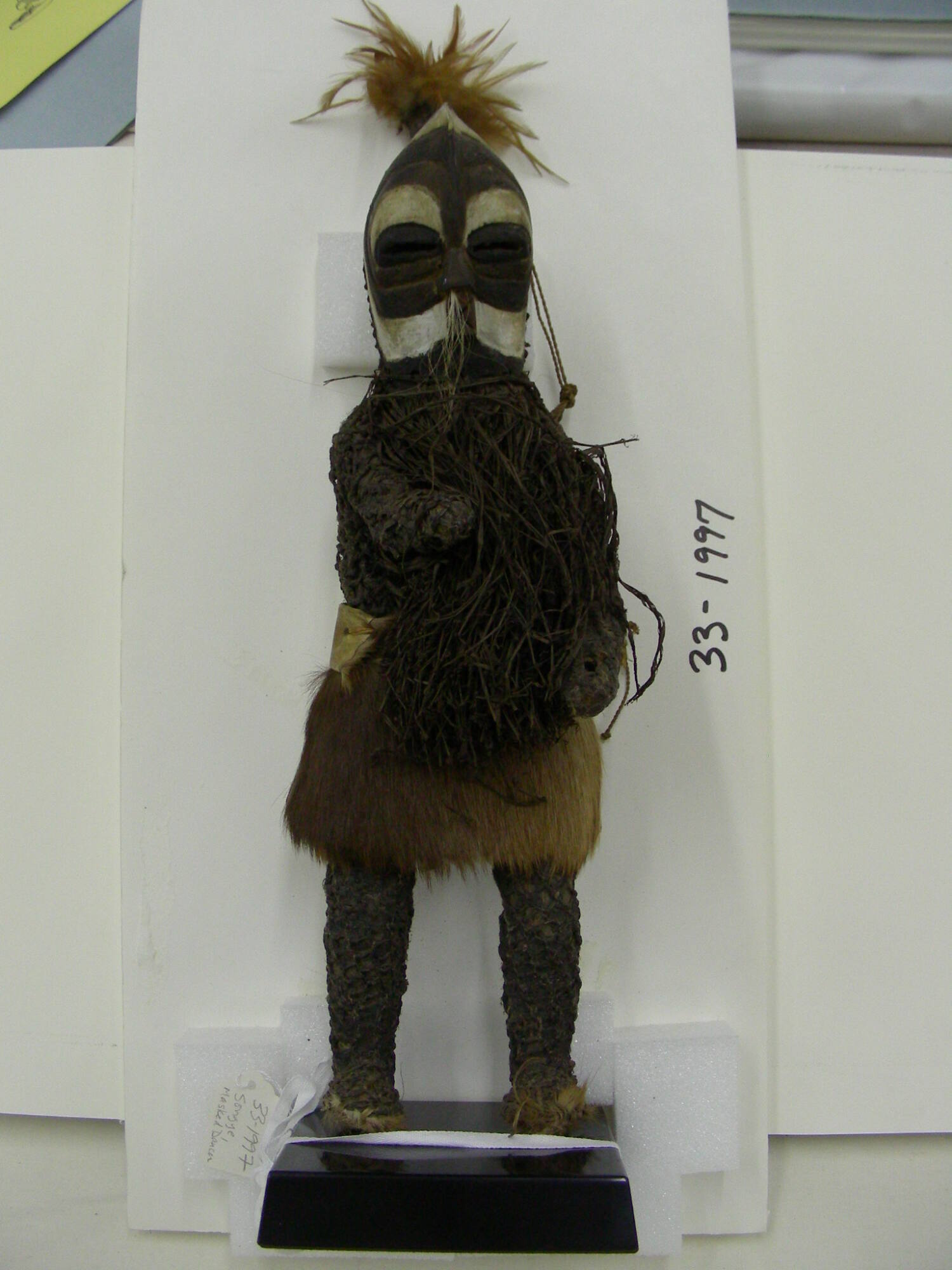 DescriptionStanding figure with a skirt of animal pelt, wearing a mask which is white and dark details, with coiffure adornmentProvenanceMr. Kalema [1];