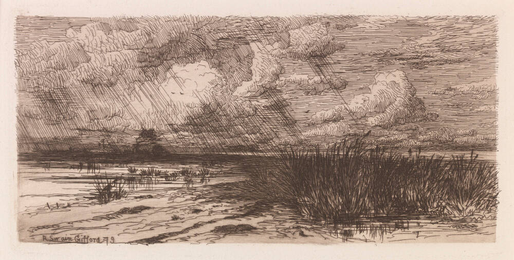 DescriptionLow-horizon landscape with short reeds growing in shallow tidepool, left; taller clumps of cat tails on sand, right. Cloudy sky with diagonal lines of rain.Gallery LabelRobert Swain Gifford, like James Abbott McNeill Whistler, was one of America’s most influential etchers of the late 1800s. Largely self taught, he first experimented with etching as a teenager. Summer Storm shows Gifford’s strengths and technique. He was renowned for his dexterity and strong yet simple use of line. To the extent that he employed special effects such as plate tone (the selective wiping of a plate that allows a thin layer of ink to create gradations in tone during printing), this effect was always secondary to the effects of line. His subtle use of plate tone plays a supporting role to the lines that evoke billowing clouds and driving rain.