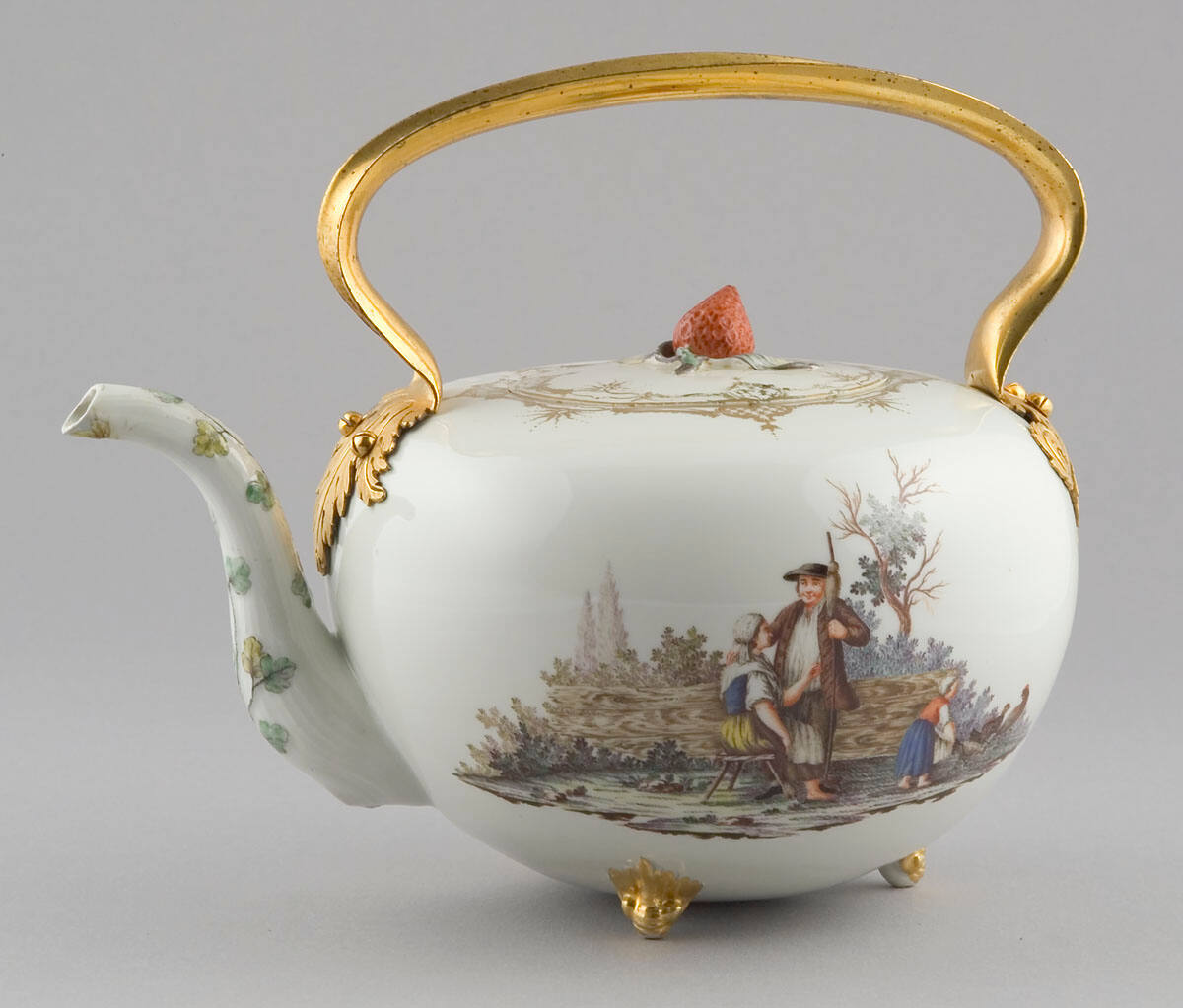 DescriptionCompressed globular form on three small gilded C-scroll feet; curving molded spout with polychrome enamelled leaves; flat cover with red enamelled straw- berry knop. top terminating in three-part leaves. Obverse and reverse of kettle enamel painted with rustic scenes: left of handle, standing man with staff and seated woman; right of handle, three men (one with scythe), one woman holding rake; gilded rim on lid and pot.Exhibition HistoryLuxury and Passion: Inventing French Porcelain, The Nelson-Atkins Museum of Art, Kansas City, Missouri, August 13 2022–August 12 2024, no cat.
