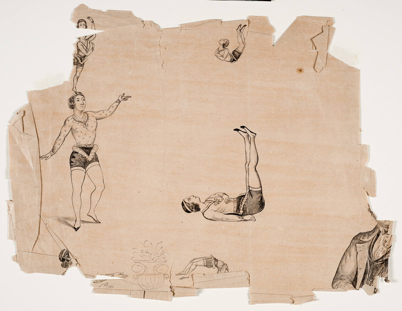 DescriptionOne of four fragments of a large drawing of tumblers and acrobats. Torn at vertical and horizontal central folds. Edges torn and folded. Portrait of a man (European) and child at center of page. Man's face is torn away, as are parts of his and the child's body. Remainder of page filled with European acrobats and tumblers doing various stunts.